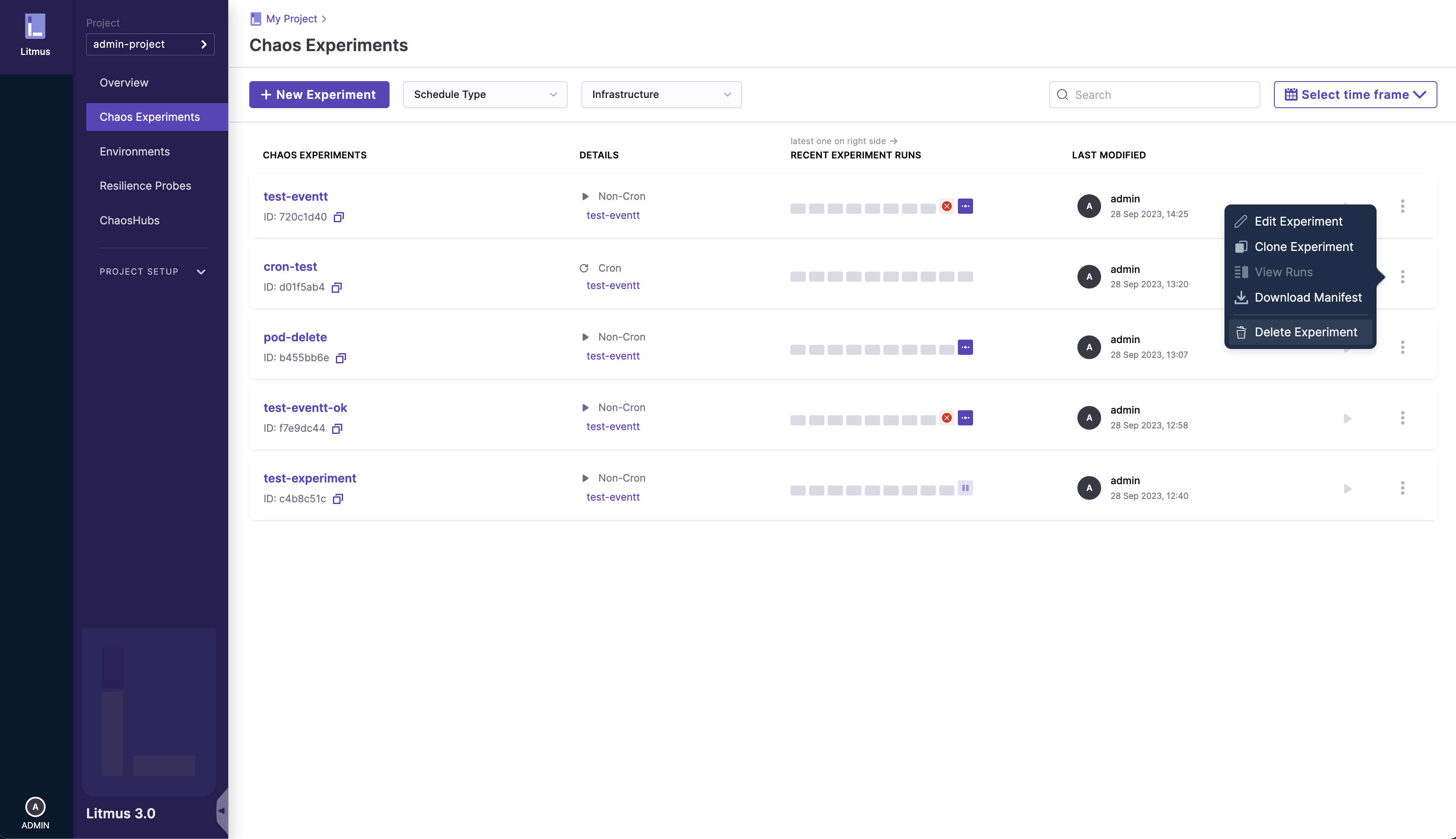 In the Chaos experiment page, go to the specific experiment you wish to delete: