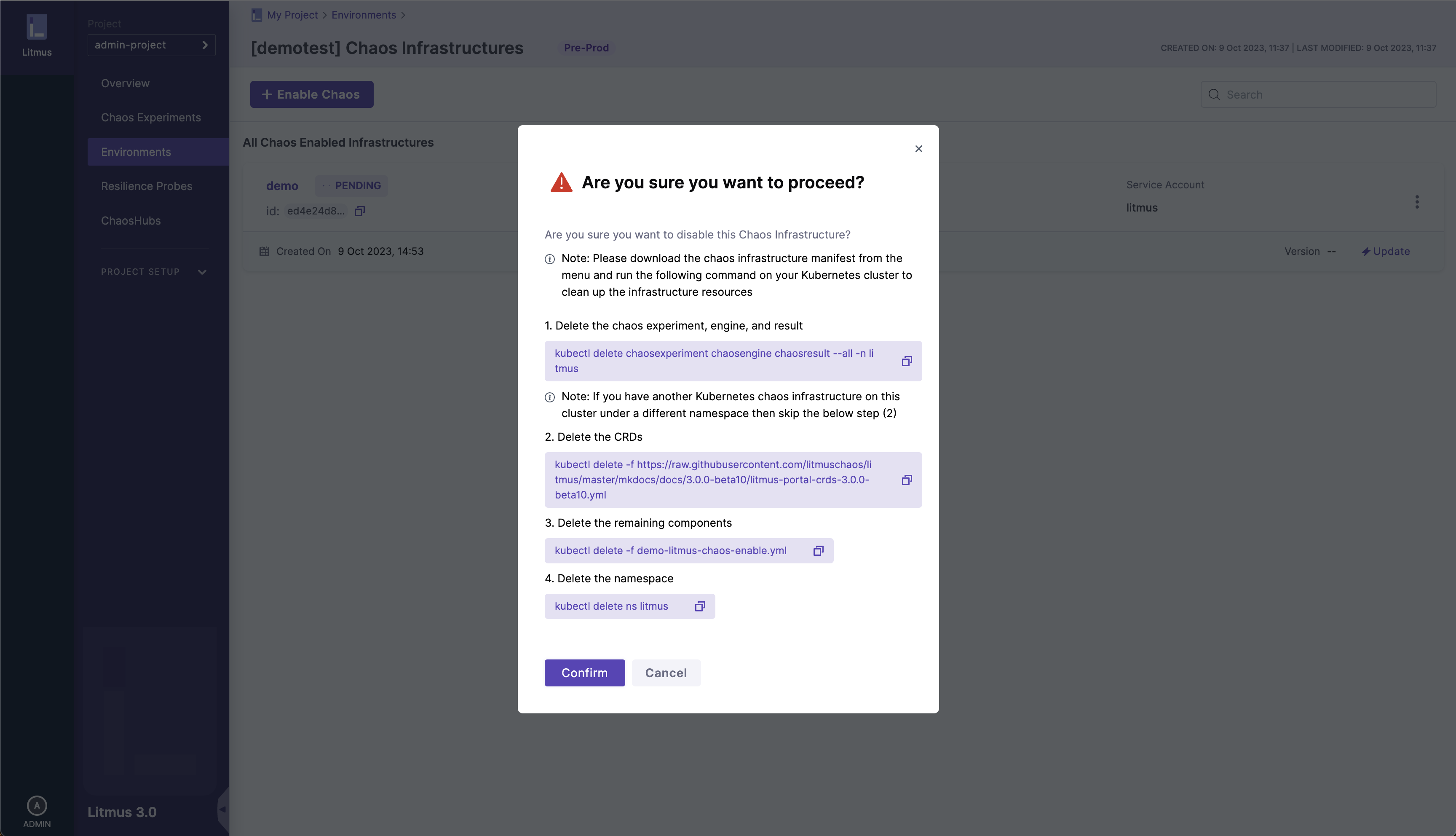After opening the options menu and clicking on the Disable option, you'll see a prompt in order to confirm your action. Please ensure that you want to delete the selected infrastructure and click the Confirm button: