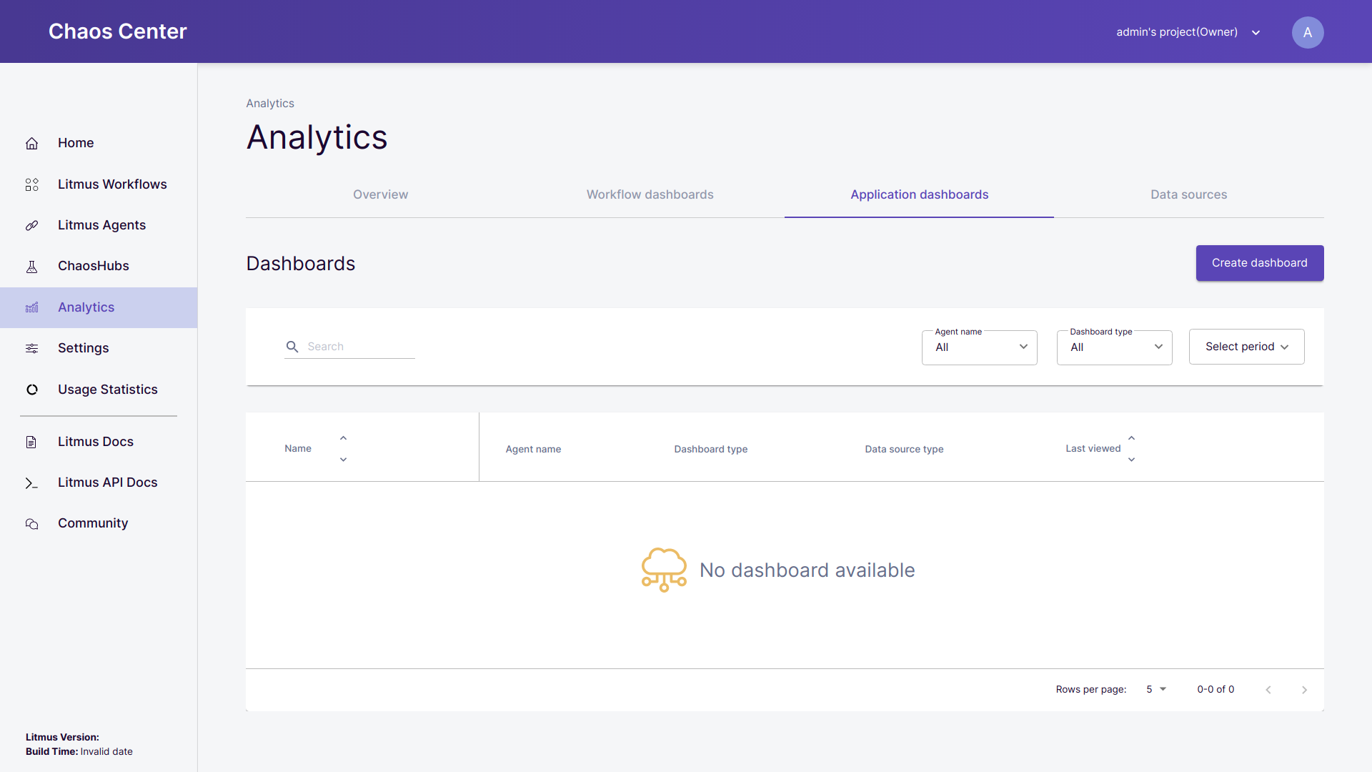 All the configured dashboards are listed under the Dashboards table. The table provides you all the details related to the dashboard like the name of the dashboard, the chaos delegate with which it has been connected, type of the dashboard, connected data source type and the last date it was opened.