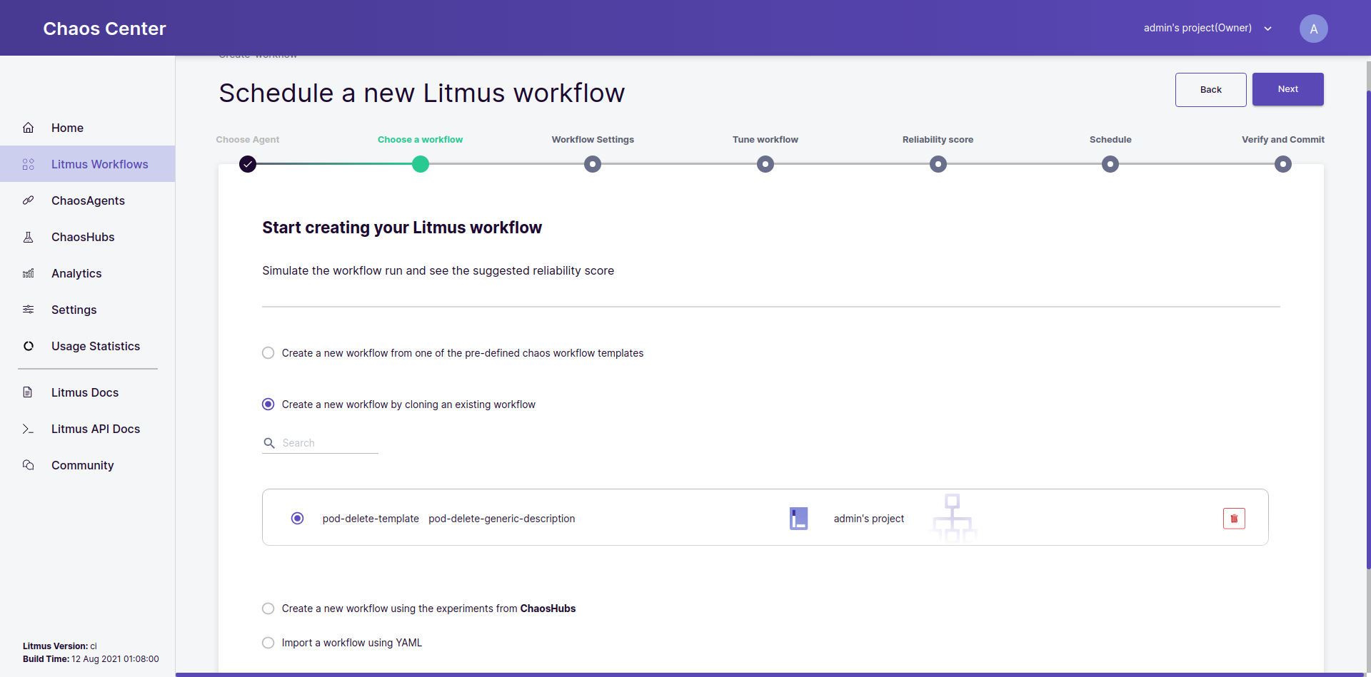 You can now see your template under the Create a new chaos scenario by cloning an existing chaos scenario option in the chaos scenario scheduling steps and can directly use it for your chaos.